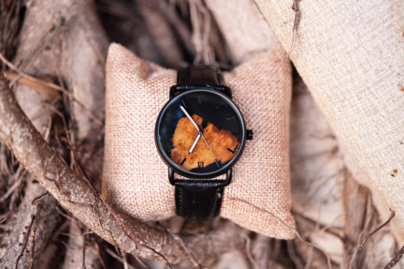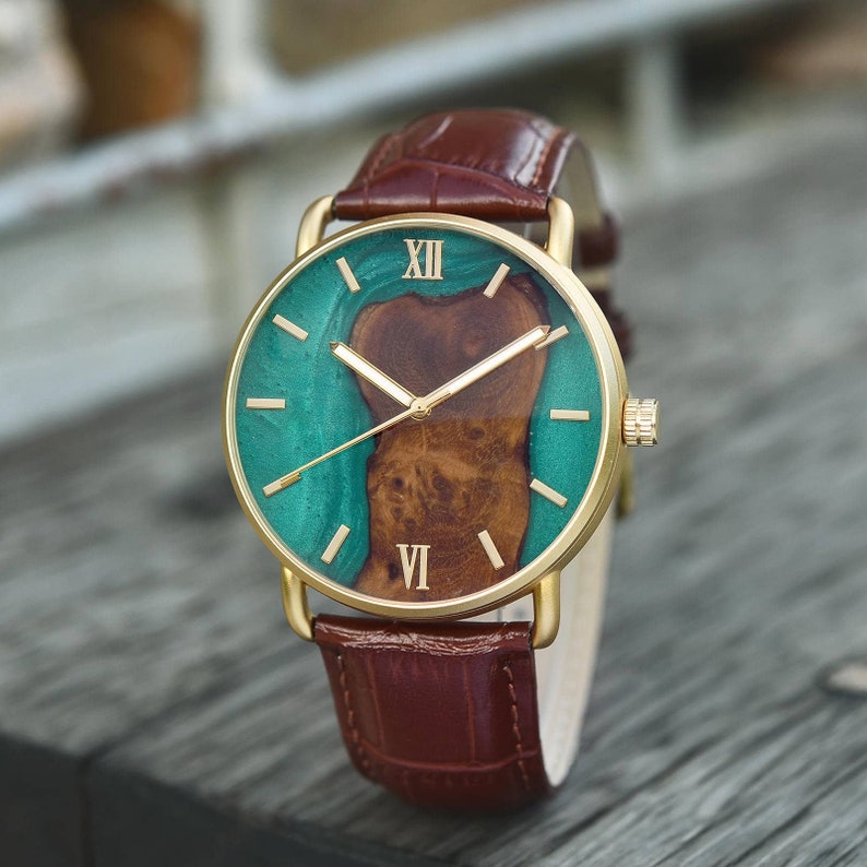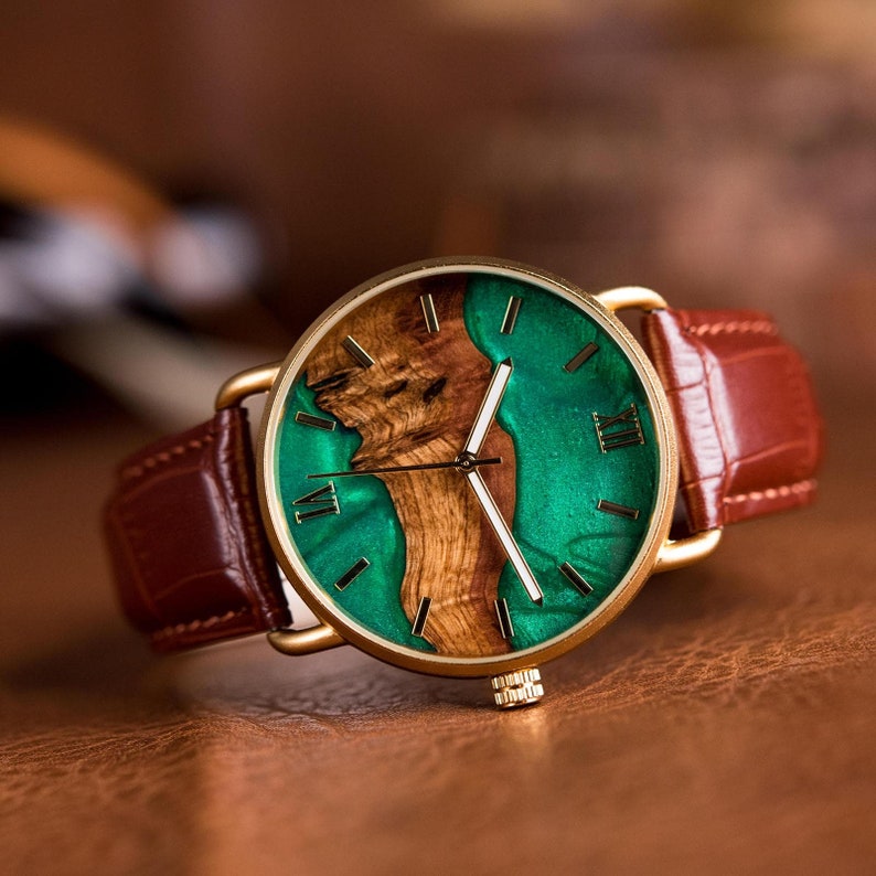 If you're looking for a thoughtful, unique, and high quality personalized gift for him, this Engraved Watch is just perfect. This beautiful watch is handcrafted from olive wood and epoxy resin and features a genuine leather strap, giving it a one-of-a-kind look and feel.