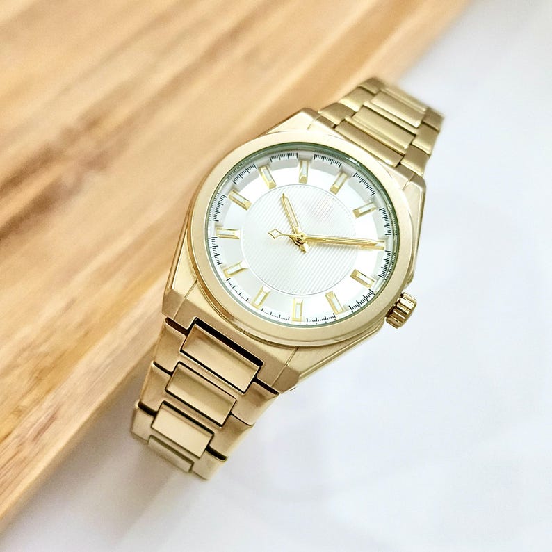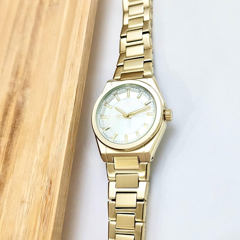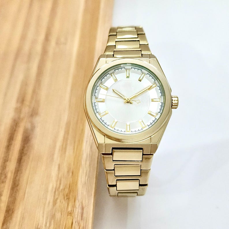 Gold Colour Women Wrist Watch, Modern Design, White Dial, All Stainless Steel, Easy Adjustable Band, Stick Indexes,Case Size: 1.29 Inch (33 mm)Case Thickness: 0.39 Inch (10 mm)