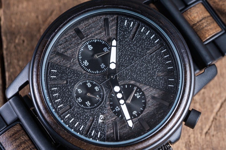 Our unique masterpiece will make an amazing gift for your Partner, Husband, Boyfriend, friends, and families. Make your special day with the special gift with our personalized watch which will make unforgettable memories. Our watch is precision-crafted from African wood and features a steel strap finely polished to bring out the perfect timepiece. This unique piece features a modern design with a stylish black face that features a chronograph minute, 24-hour subdial, printed seconds track, and date window at 4 o’clock, with stainless steel double locking clasp.